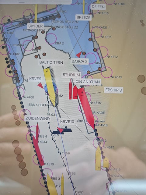 “Ik ben nu op de loodspost in de Pistoolhaven om de reis voor te bereiden. Ik maak een tijdsplanning van de reis en kijk vervolgens wat ik tijdens de reis kan verwachten aan weer, stroming en verkeer. Even later is de loods met wie ik mee ga er ook, en samen spreken we de reis nog een keer door. Dan is het tijd om richting het schip te gaan. Eenmaal aan boord ligt het schip al op vertrek. De kapitein vindt het prima als ik, als student, manoeuvreer dus dat is een mooi begin. Vervolgens varen we van de Tweede Maasvlakte richting de havenmond, waar net een afgeladen tanker binnenkomt. We passeren zoals we hebben afgesproken en draaien vervolgens rond het lage licht de Nieuwe Waterweg op. Bij de Botlek wordt het weer wat drukker, maar de kapitein vindt het prima als ik ook de aankomstmanoeuvre doe. We draaien de Botlek in en varen vervolgens achteruit de St. Laurenshaven in die aardig vol ligt met aangemeerde schepen. Onder toeziend oog van de kapitein en loods meren we af tussen de boeien in de St. Laurenshaven.”